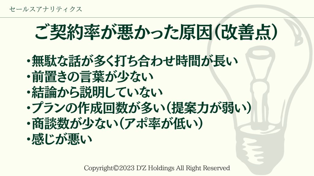 ご契約率が低かった原因を、西浦と杉浦の比較を通じて洗い出してみました。 商談を比較検討し、不要な発言がないかなどを分析していきました。 実際に30分以上かかることがあった杉浦の商談に焦点を当て、打合せ時間が長い原因を尋ね … 続きを読む セールスアナリティクスセミナー その2